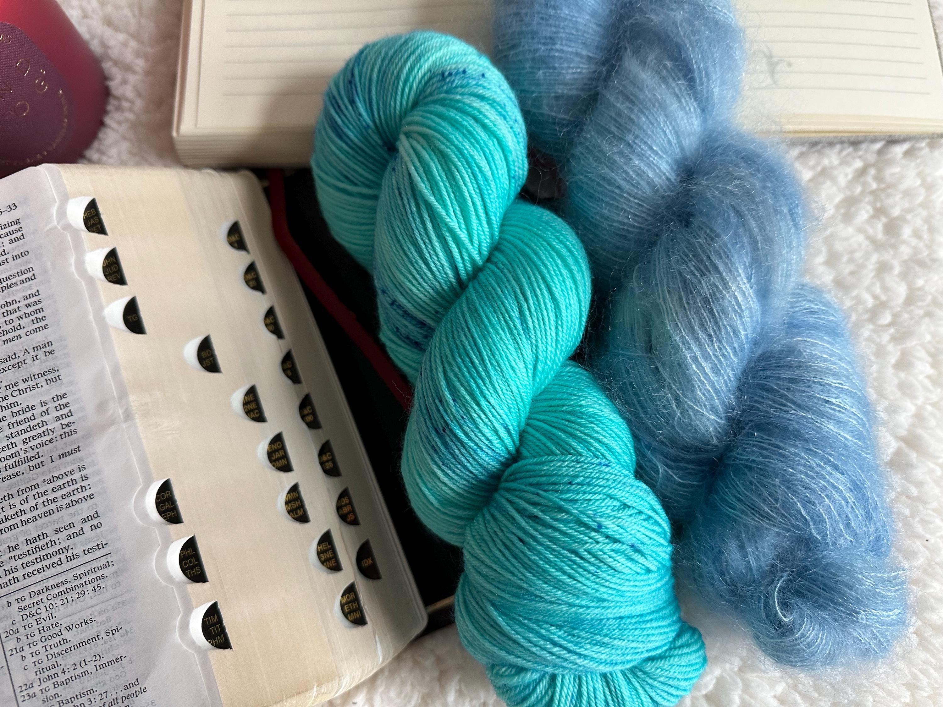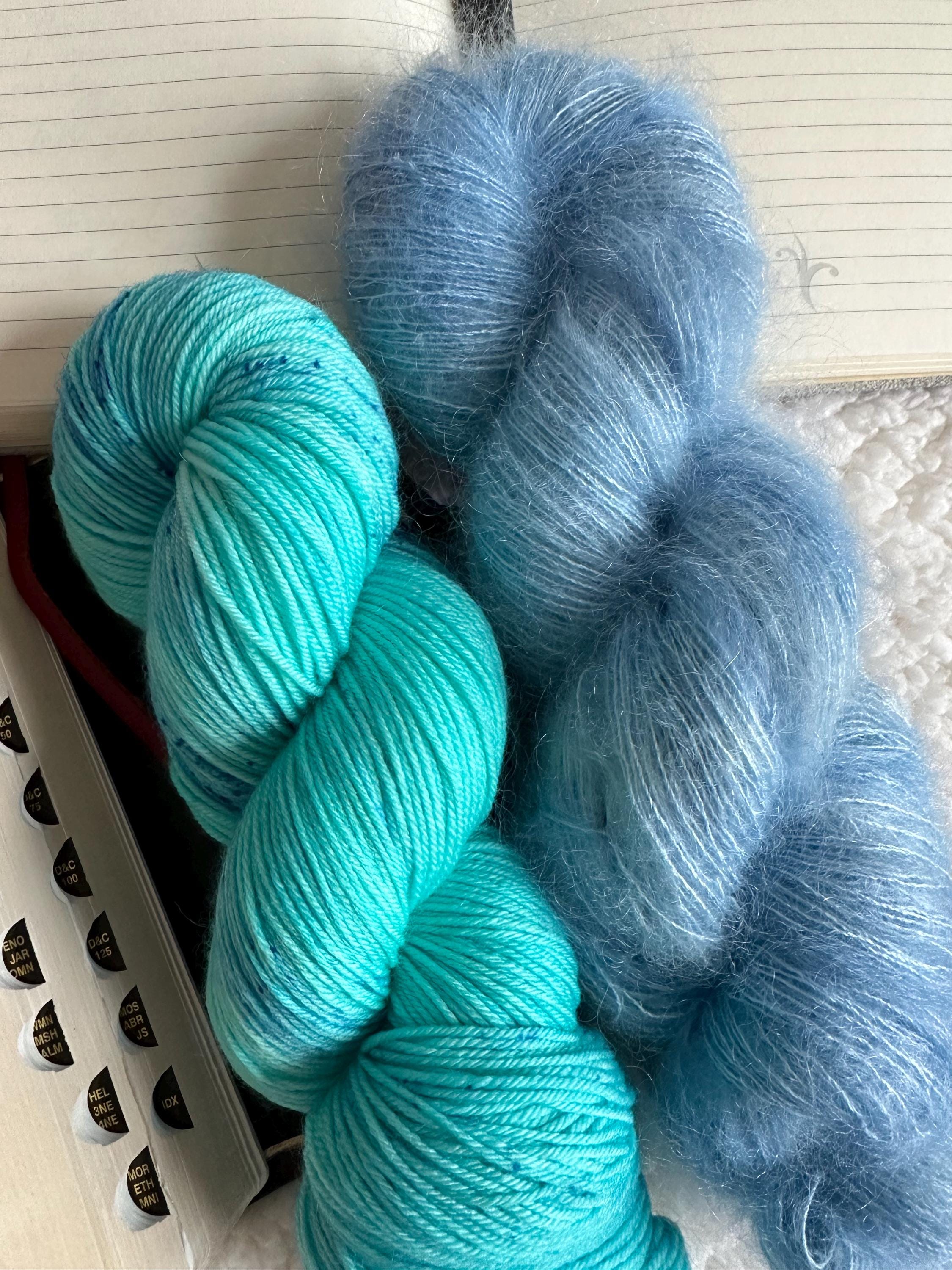 This listing is for Honesty - a beautiful bright palette of turquoise on Biography Sock with a sky blue on Fantasy Fluff Mohair.