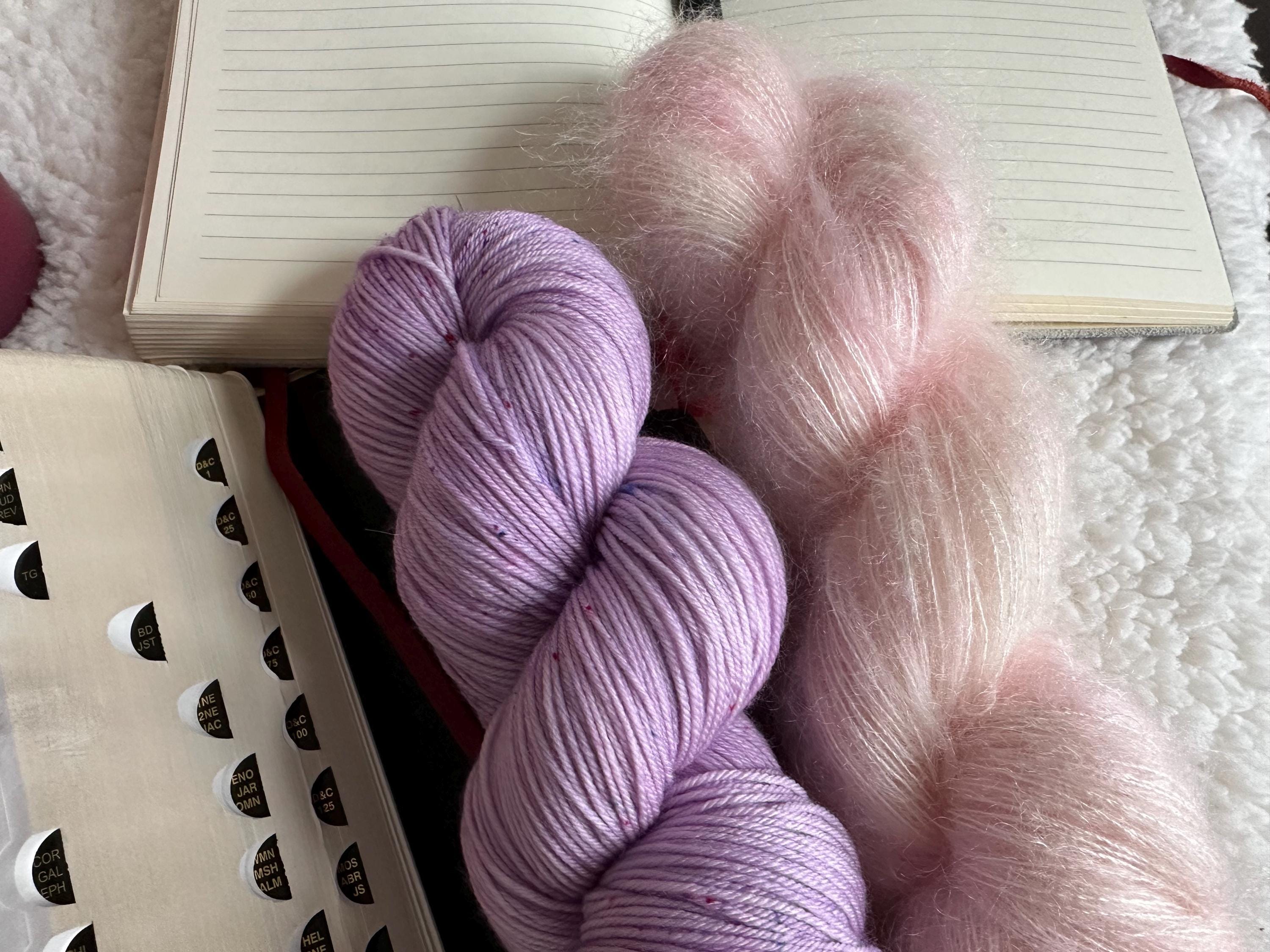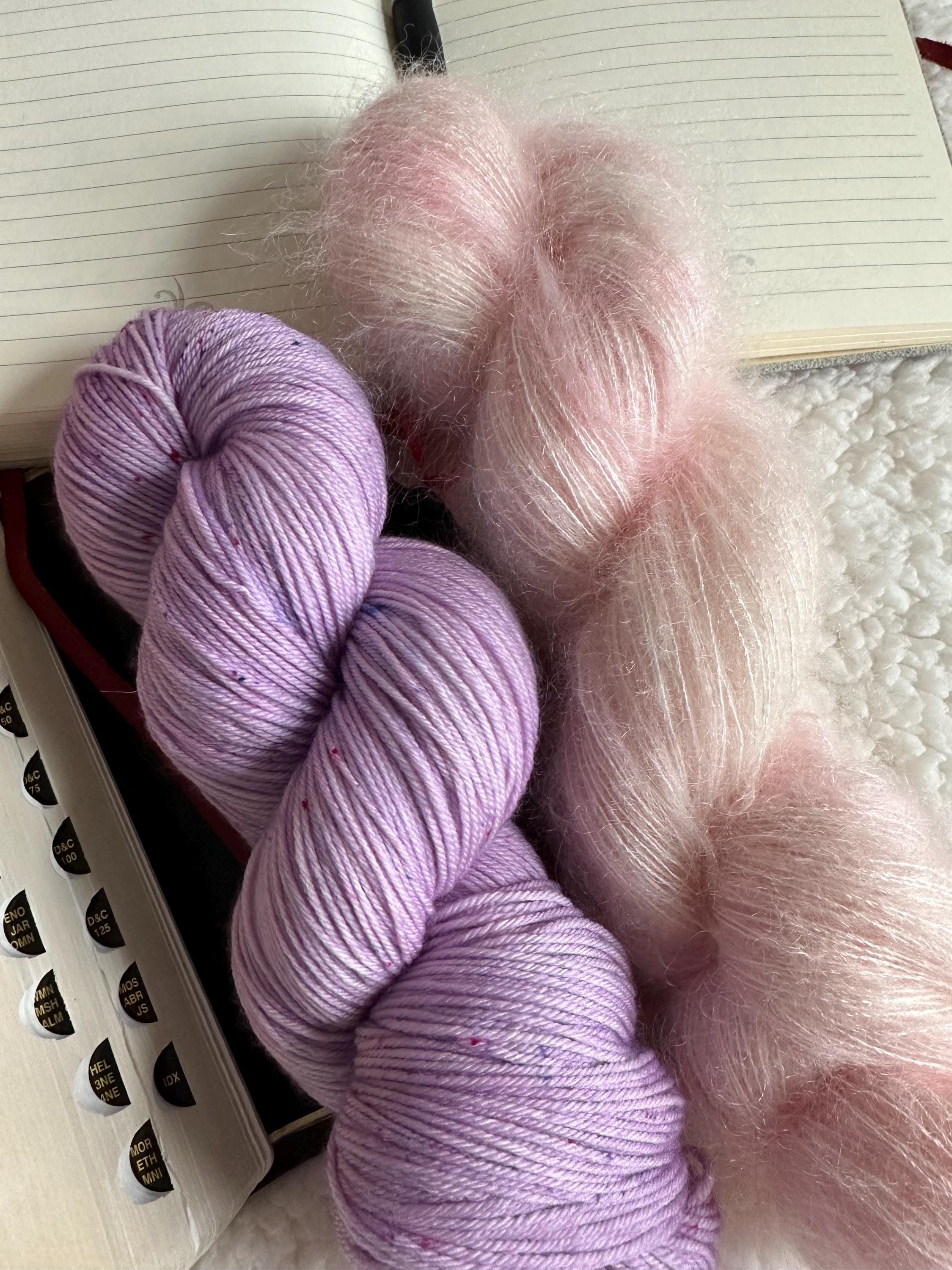 This listing is for Patience - a delicate palette of lilac on Biography Sock with a pale, soft pink on Fantasy Fluff Mohair.