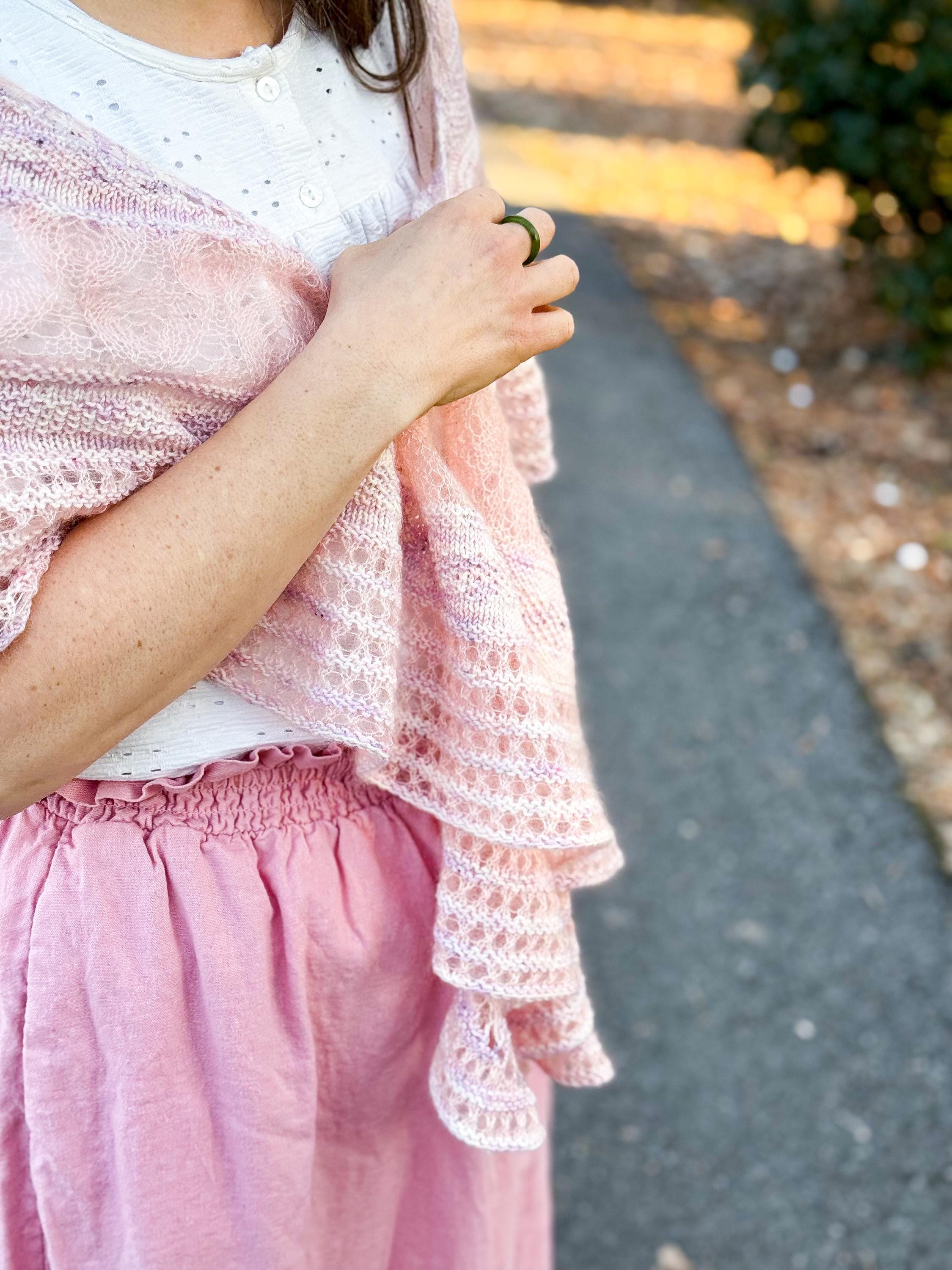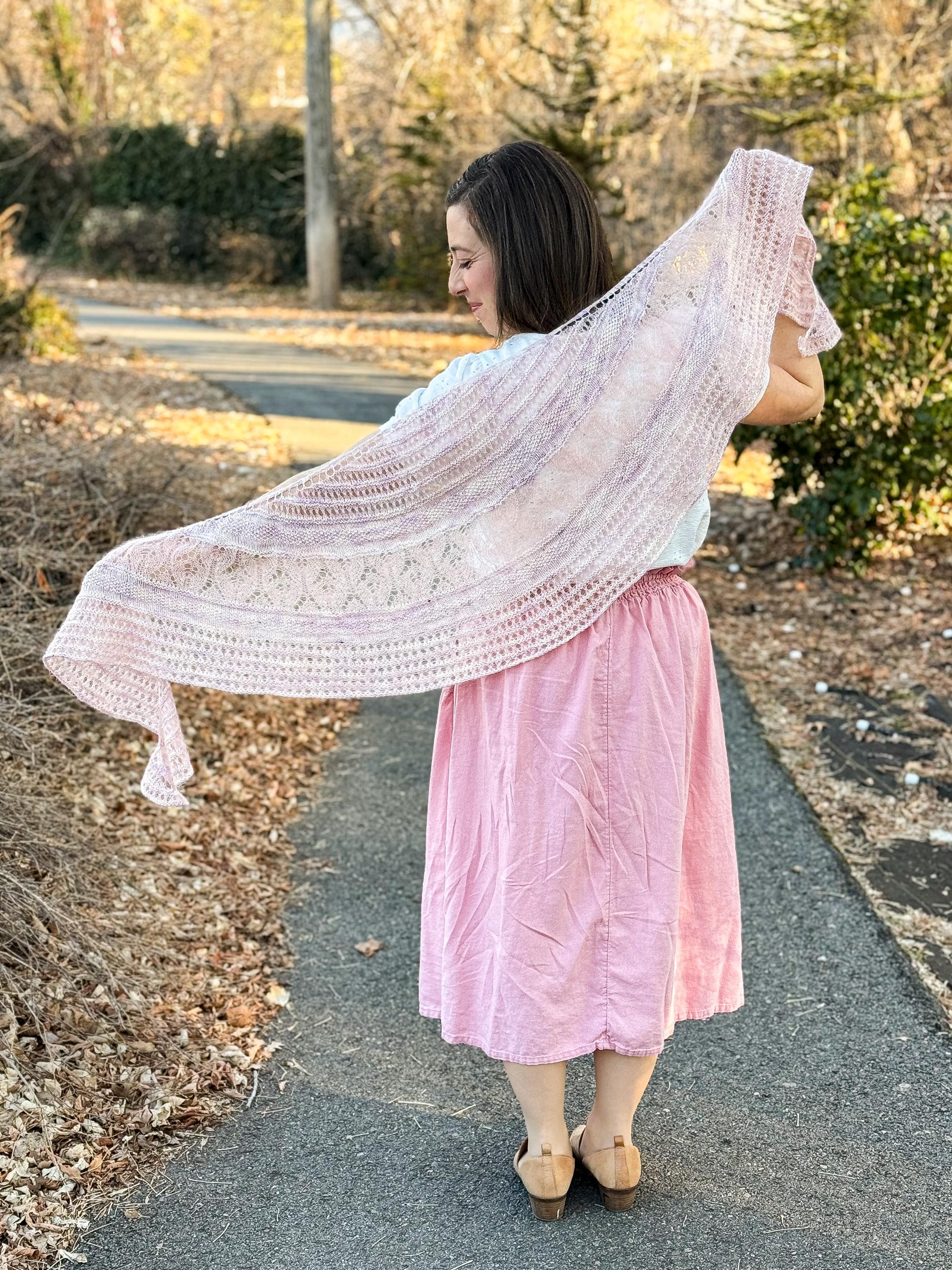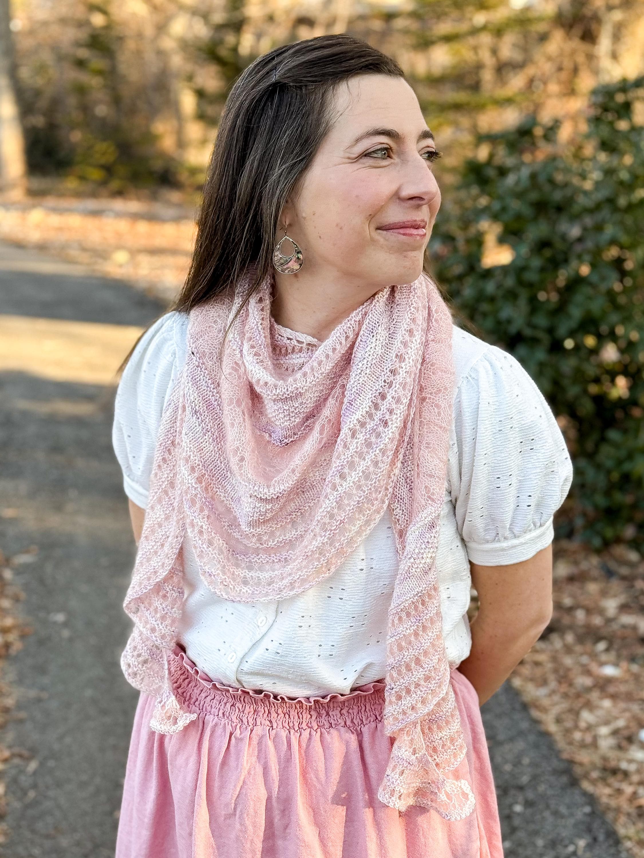 Sacred Space is a crescent shaped shawl knit with a 100g skein of fingering weight yarn and a 50g skein of mohair. It is knit from the top down, beginning with a garter tab, and includes eyelets, texture stitches, and lace for a light and airy finished shawl. Each section includes a Christ-centered devotional to help you focus on God’s love for you and your love for Him.