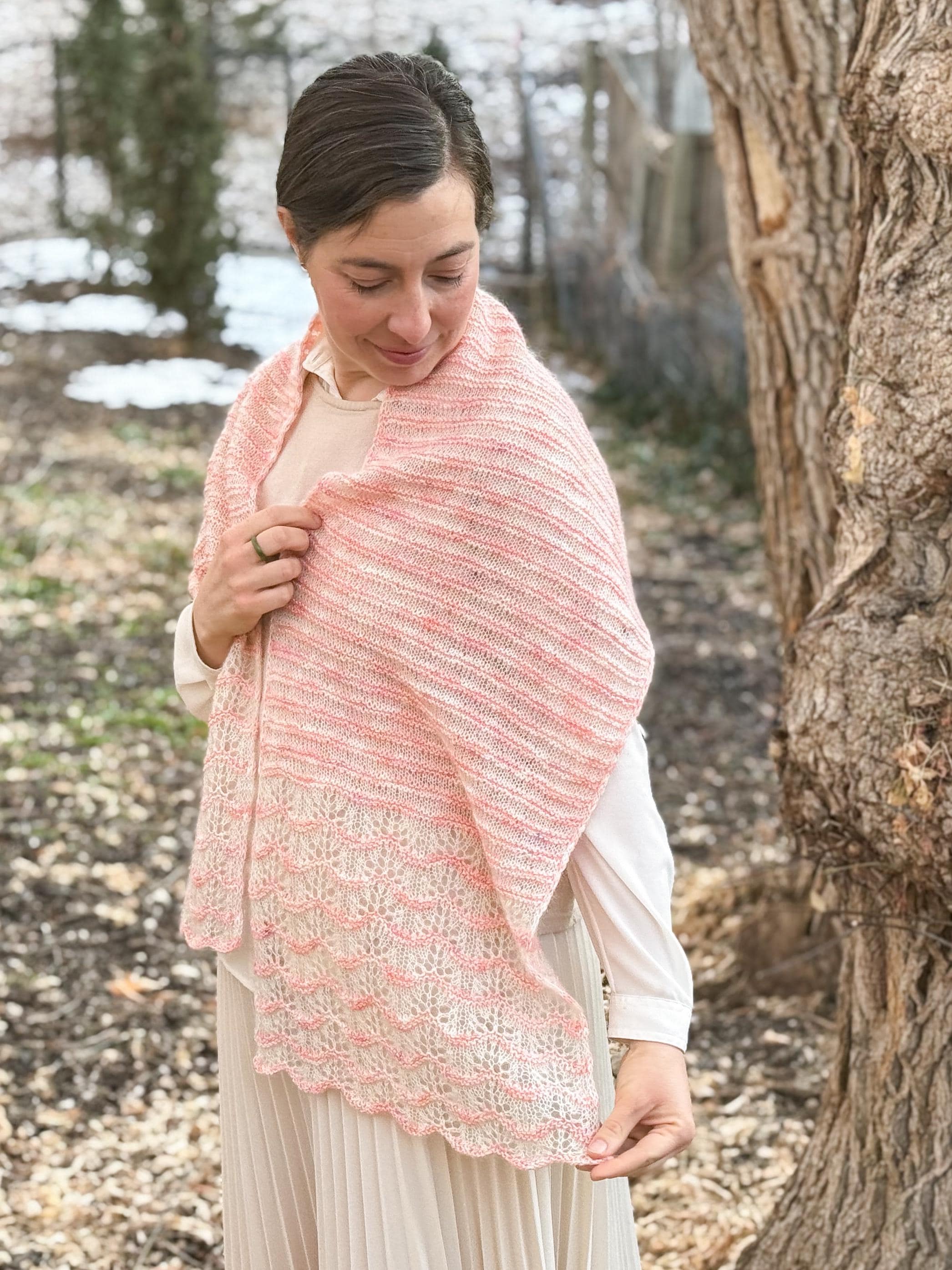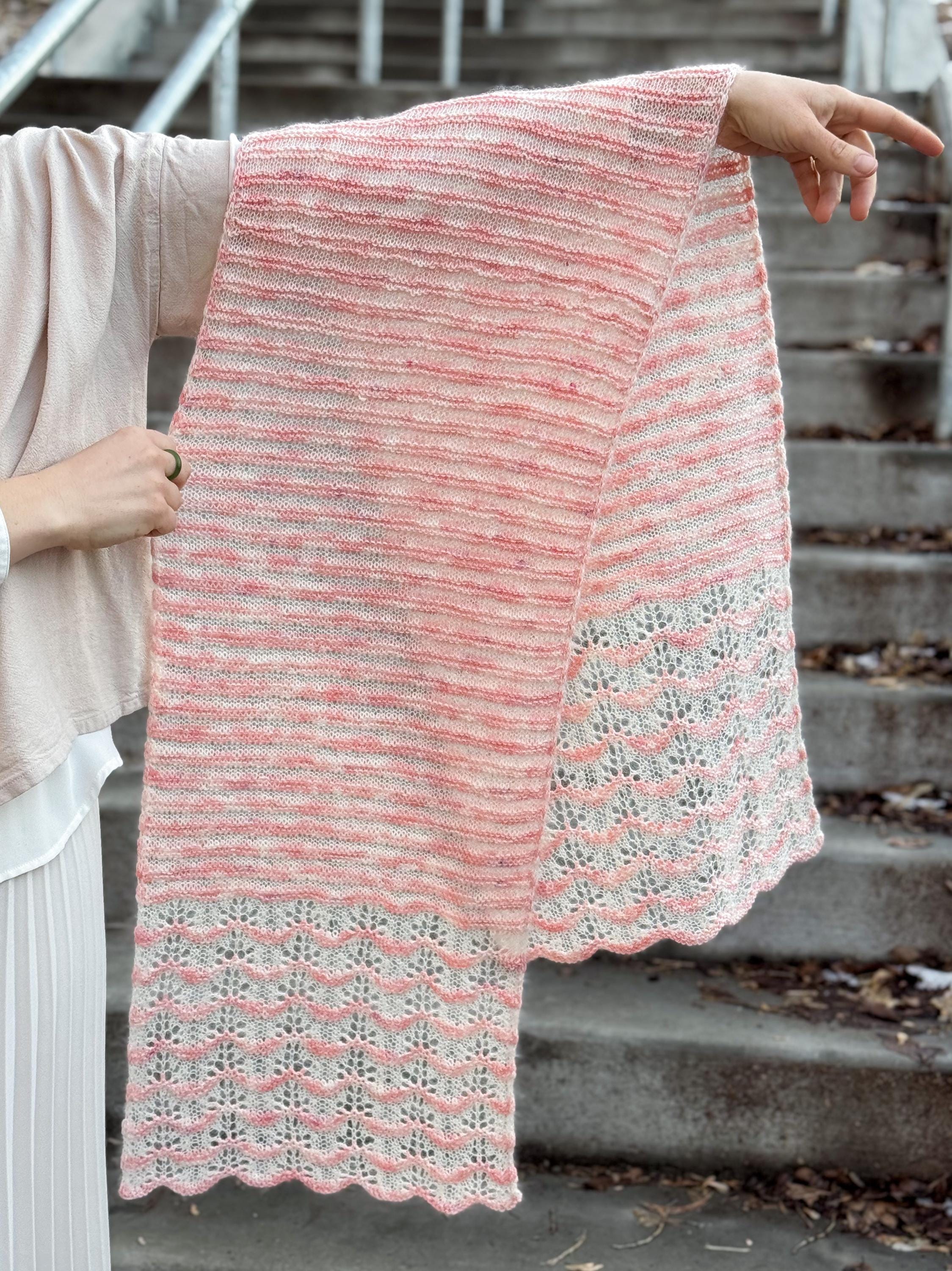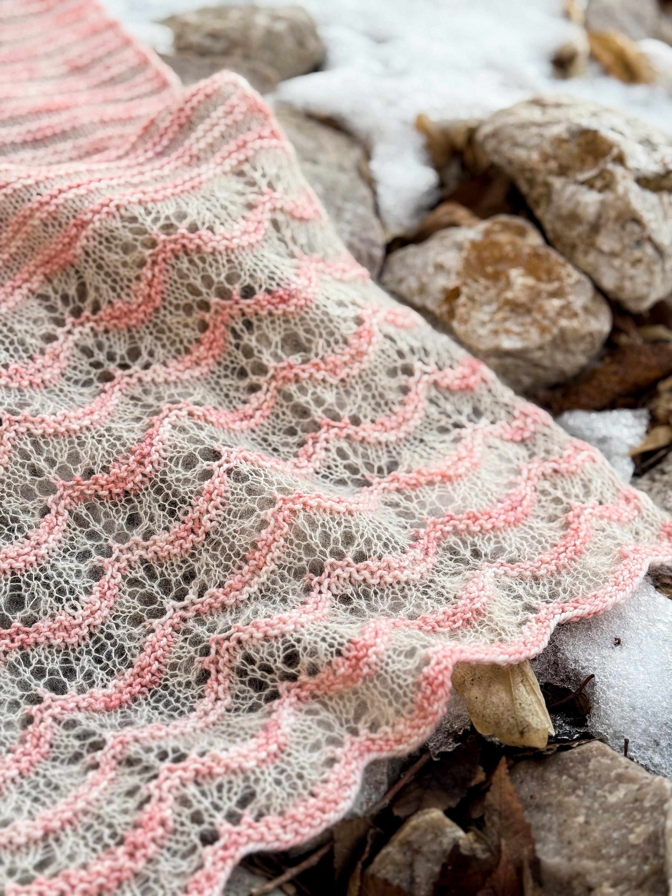 The wrap includes stockinette, garter, and lovely feather and fan lace for a delicate finish.