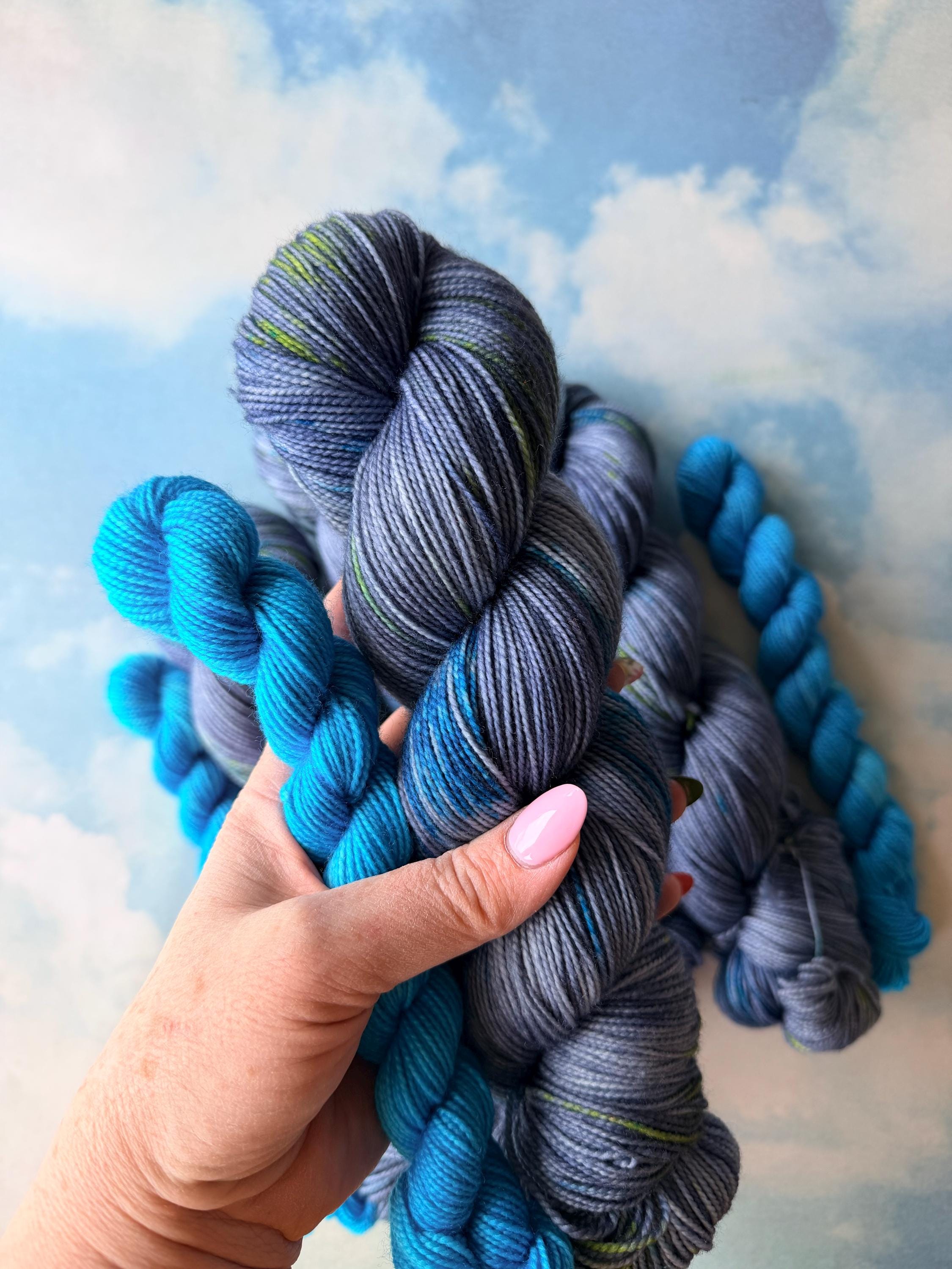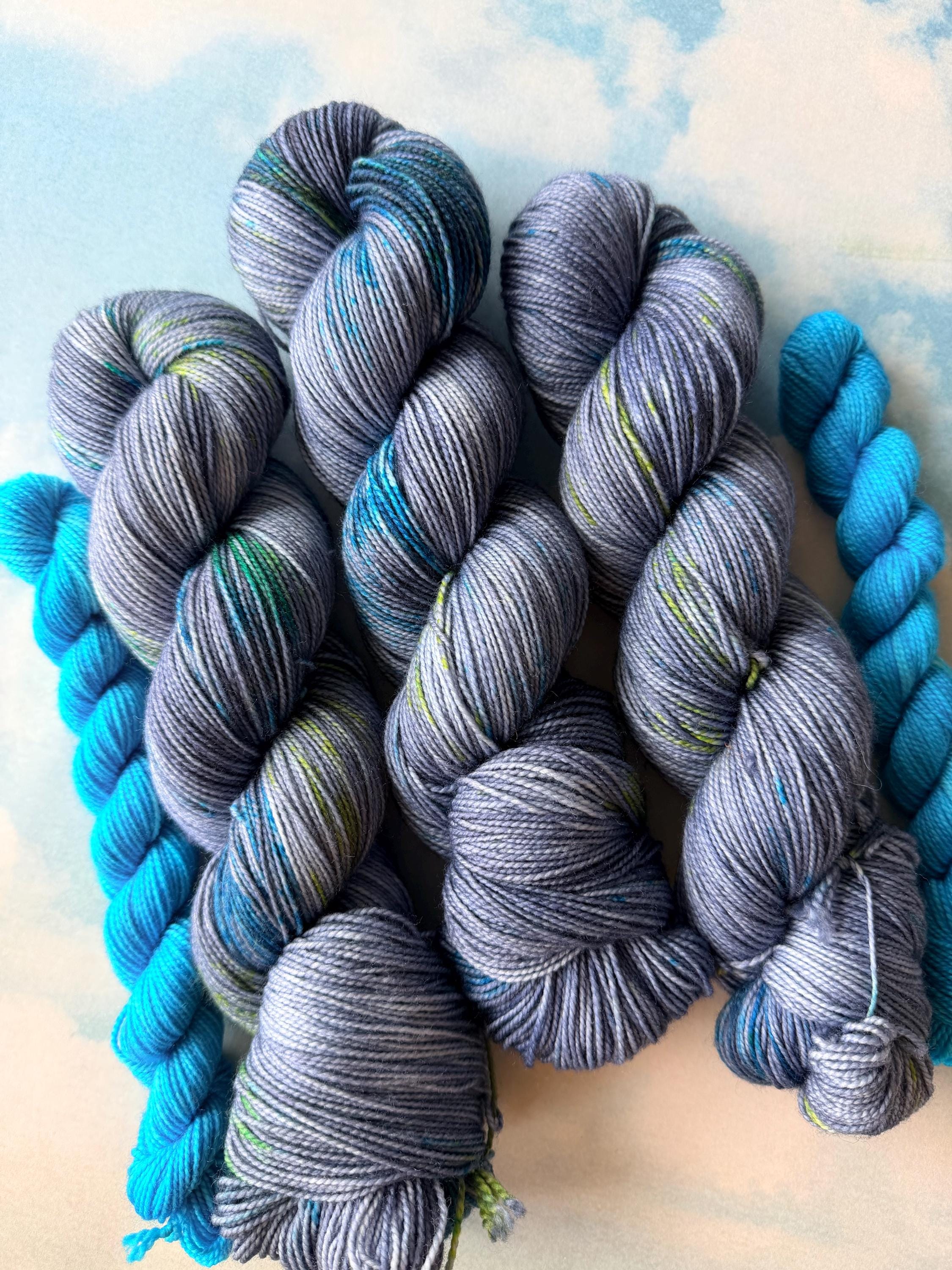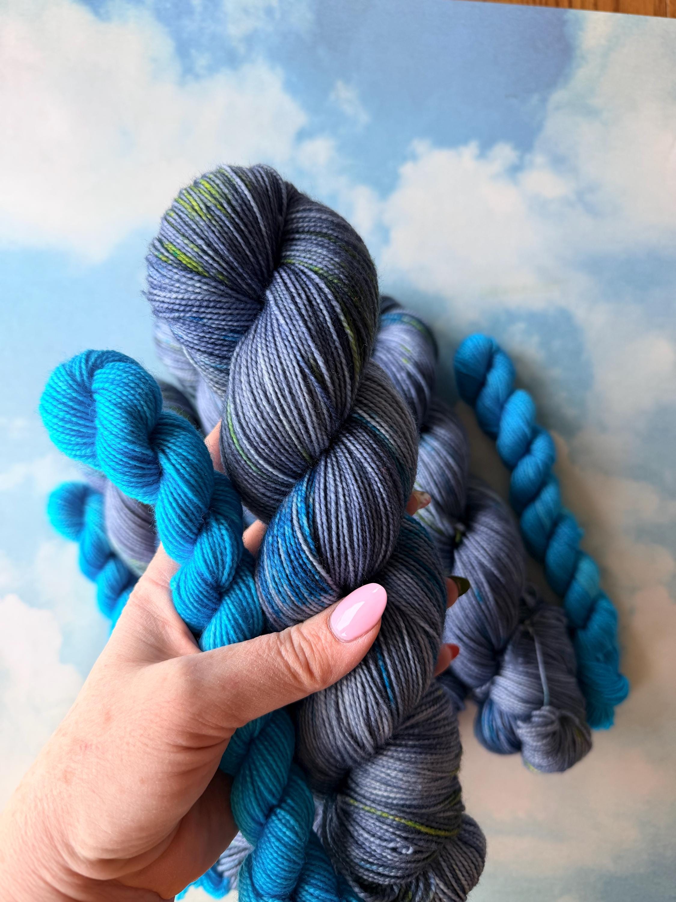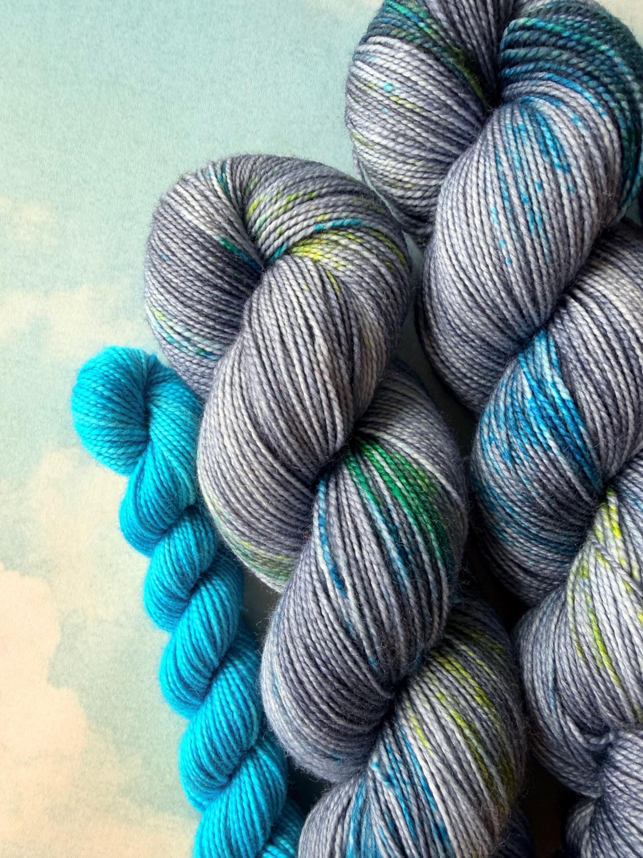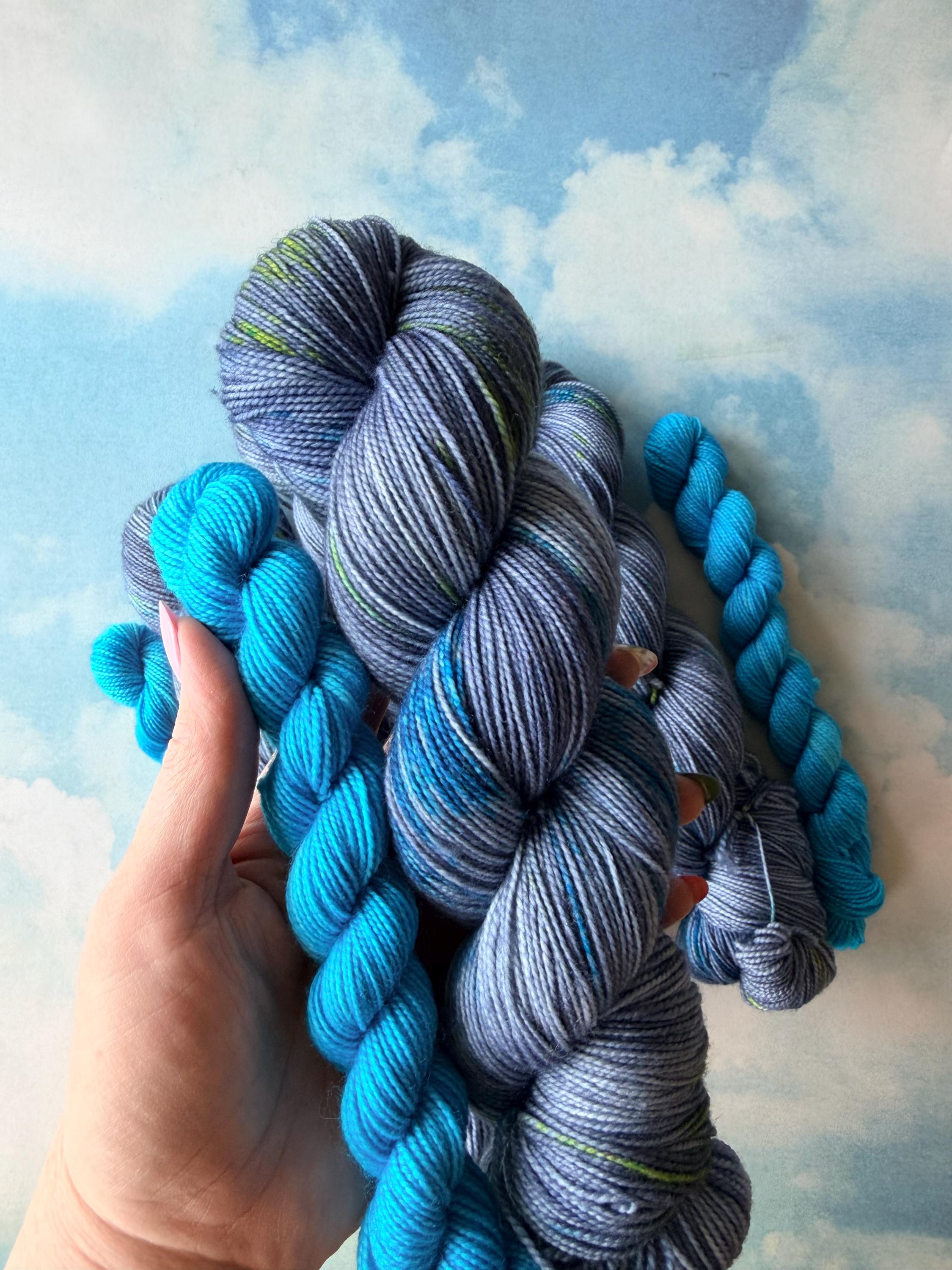 This sock set is named after a the ultimate dynamic duo - our two unlikely heroes. It includes a denim -blue main skein speckled with neon blues and greens and a neon blue mini skein.